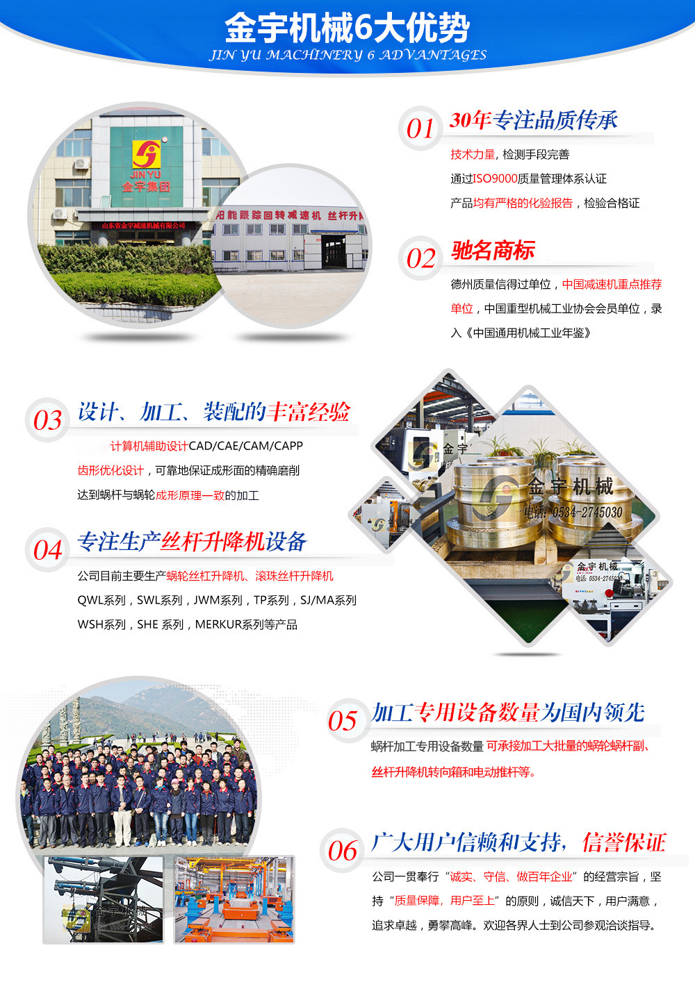 金宇機械生產滾珠絲桿升降機、絲桿升降機、QWL蝸輪絲桿升降機、JWM絲桿升降機、回轉減速機等產品。